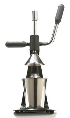 Hot off the Metrokane lineup, the L-Press is a very snazzy manual juicer designed for the modern home. Rather than building on the 1950s look of its Mighty OJ juicer, Metrokane's designers created this one with a sleek, curved-L body made of hardened steel reinforced with die-cast aluminum. Like the Mighty OJ, the L-Press uses a rack-and-pinion gear system, but interlocked with it on this model is a lever handle that rotates in a 500-degree arc, impressively creating up to 1,000 pounds of leverage. As a result, limes, lemons, oranges, and grapefruits release every bit of juice with the least amount of effort.Another nifty feature of the L-Press is the rubberized grip on both the lever and stabilizing arm, available in either a neutral gray or a dazzling traffic-cone orange. A 25-ounce stainless-steel pitcher, integral to the design, catches all the fresh-squeezed juice and features a pouring spout. After use, the removable stainless-steel strainer and cone wash up easily. The L-Press makes a fantastic gift for the aficionado of good design-and fresh-squeezed orange juice. Metrokane covers the juicer with a lifetime warranty on moving parts. --Ann Bieri